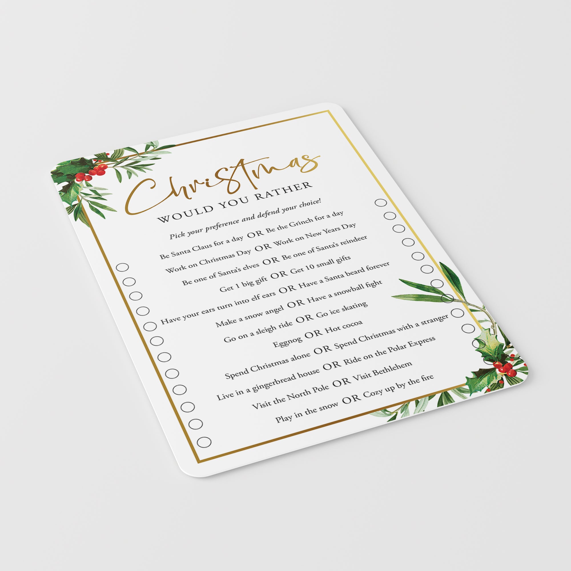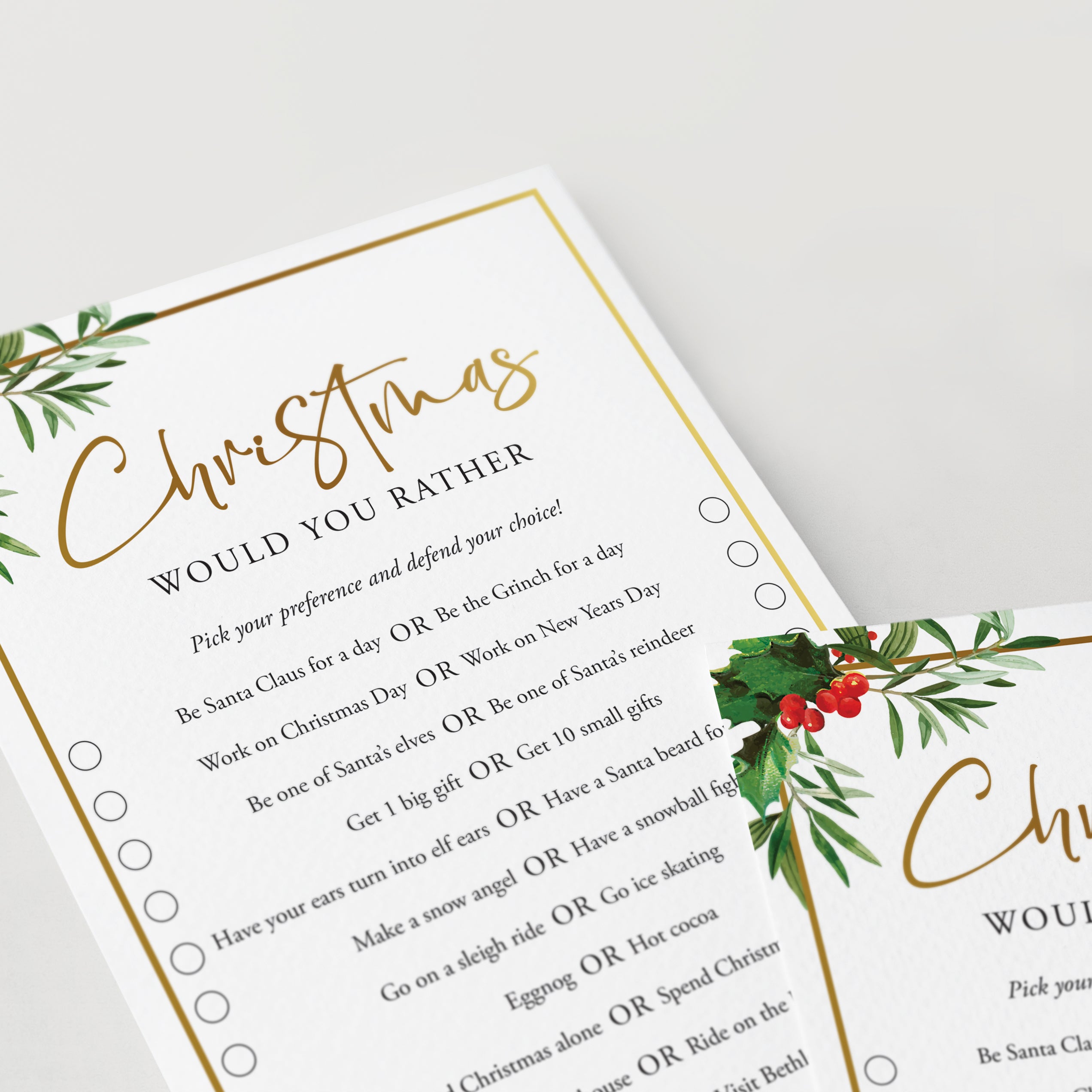 Are you looking for a fun icebreaker game for your Christmas party? Play Would You Rather. It's is a great conversation starter and will definitely get your guests mingling and laughing. This greenery theme Christmas game has 12 Would You Rather questions. Have your guests pick their preferences and defend their choice.