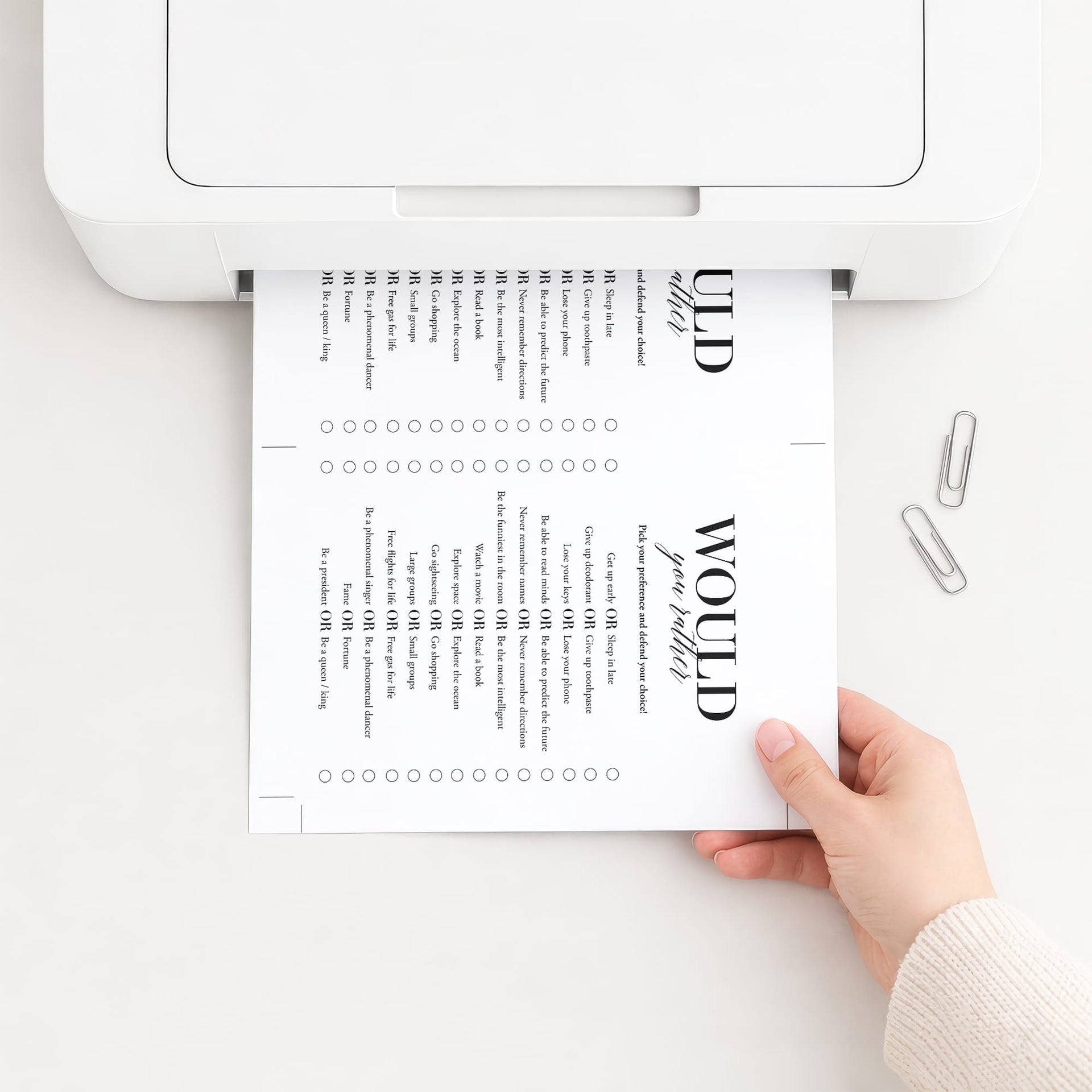 Are you looking for a fun icebreaker game for your next event? Play Would You Rather. It's is a great conversation starter for groups. This modern minimalist black and white game card has 14 Would You Rather questions for adults. Have your guests pick their preferences and defend their choice. Would you rather be able to read minds or be able to predict the future?