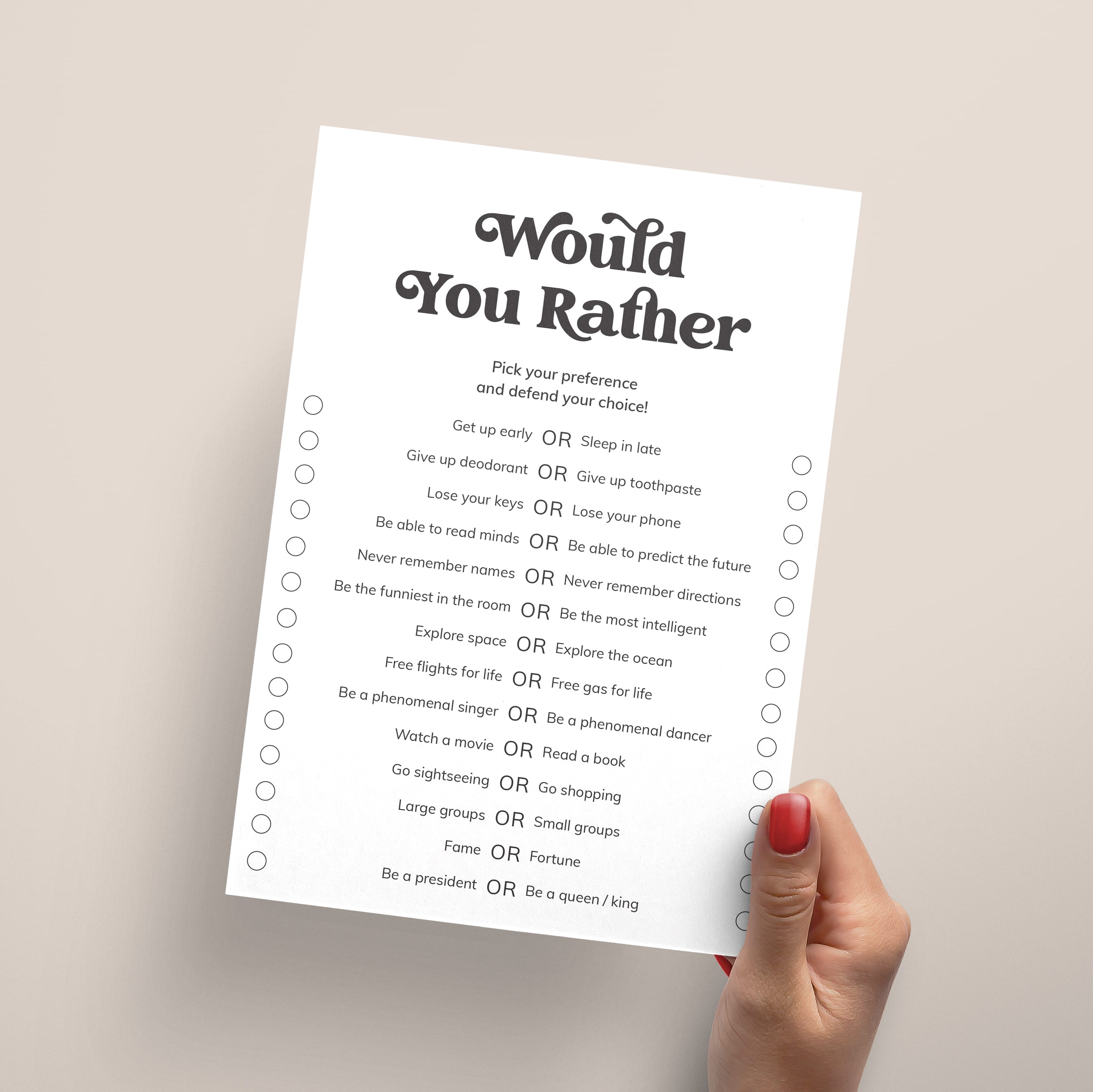 Are you looking for a fun icebreaker game for your next event? Play Would You Rather. It's is a great conversation starter. This black and white game card has 14 Would You Rather questions for adults. Have your guests pick their preferences and defend their choice. Would you rather be able to read minds or be able to predict the future?