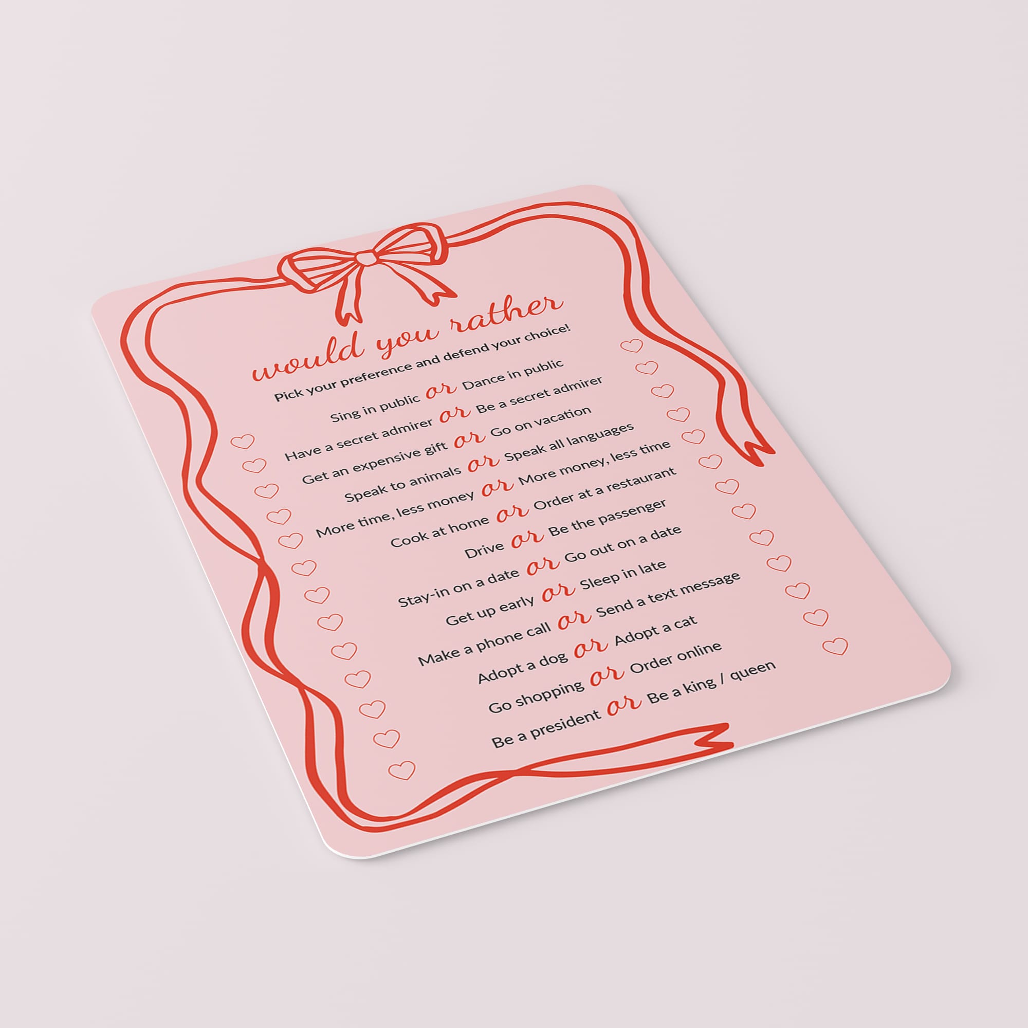 This couples Would You Rather game has 13 Would You Rather questions, also knows as This or That questions. There is only one rule: you must pick an answer. This fun couples game will help you see your partner in a whole new light!